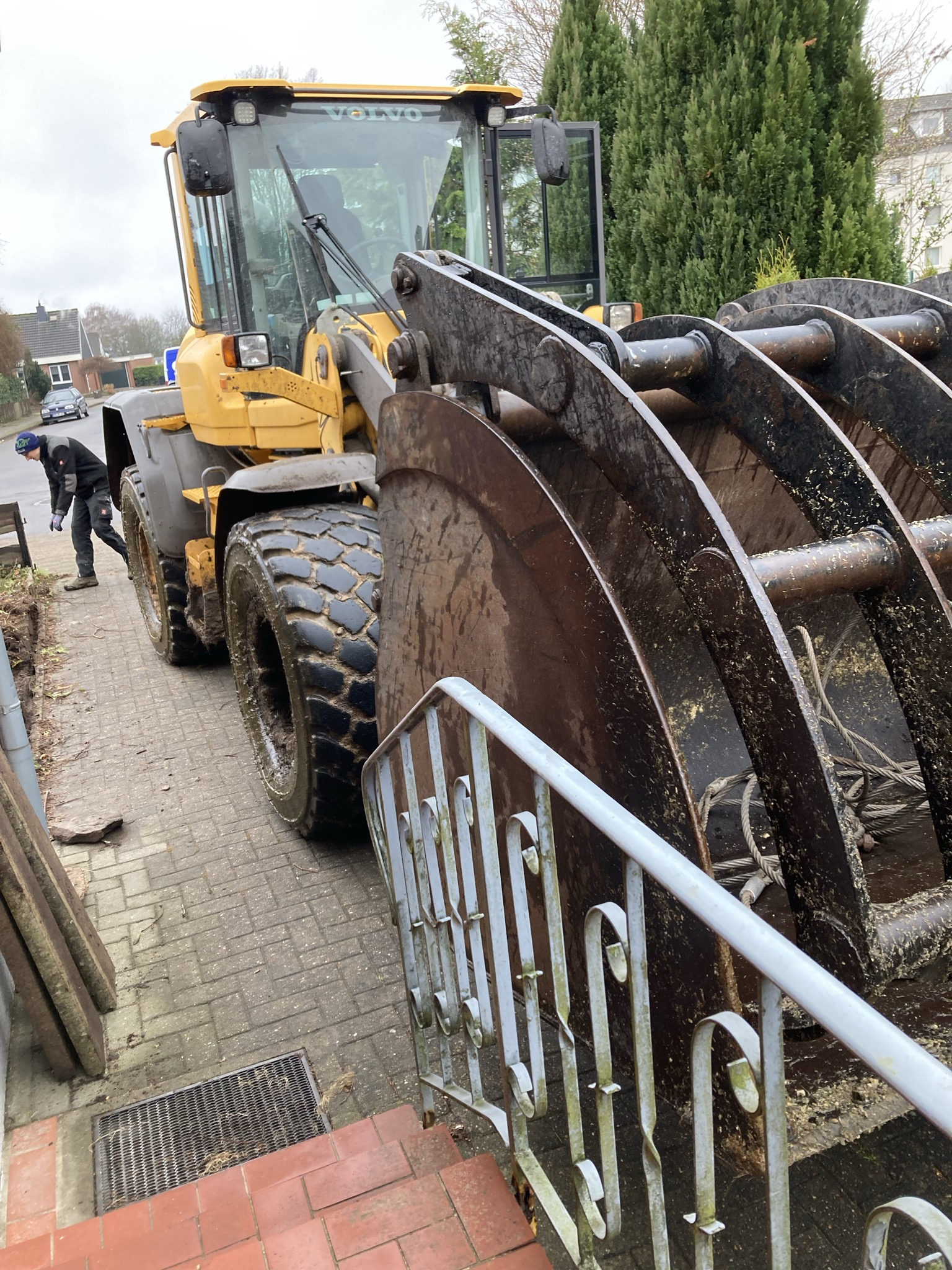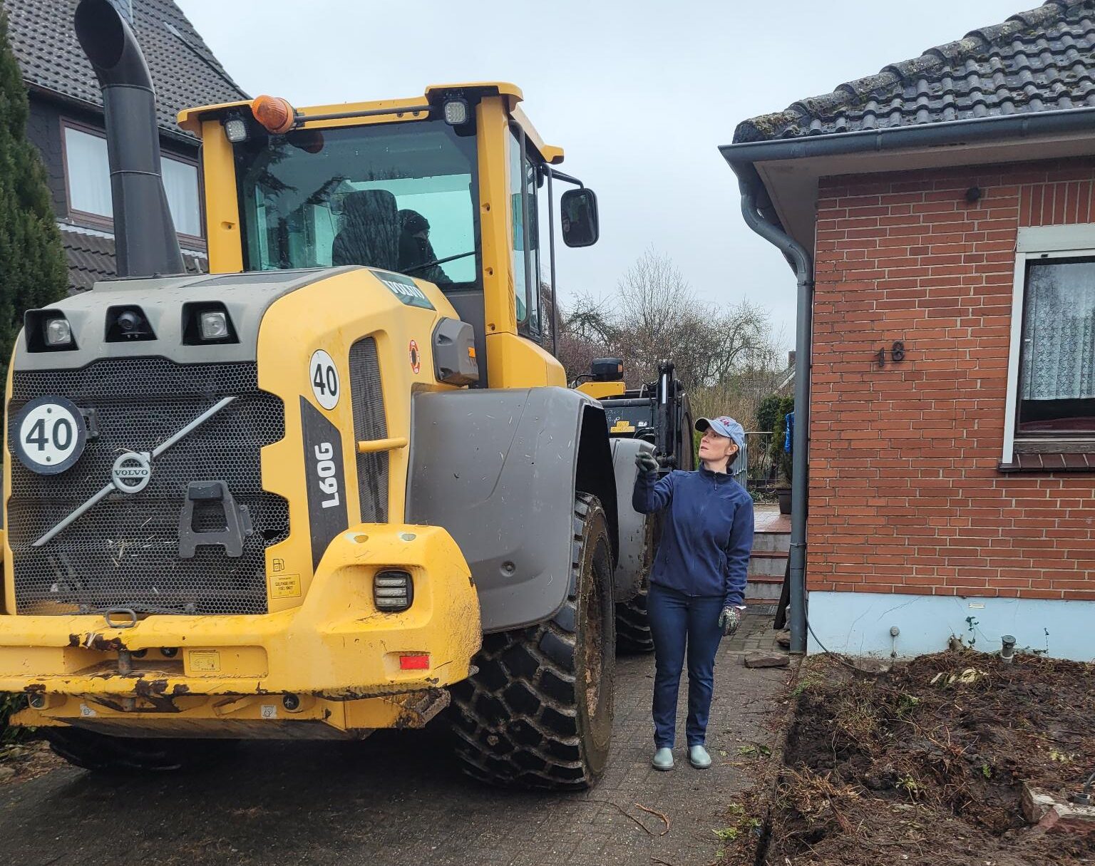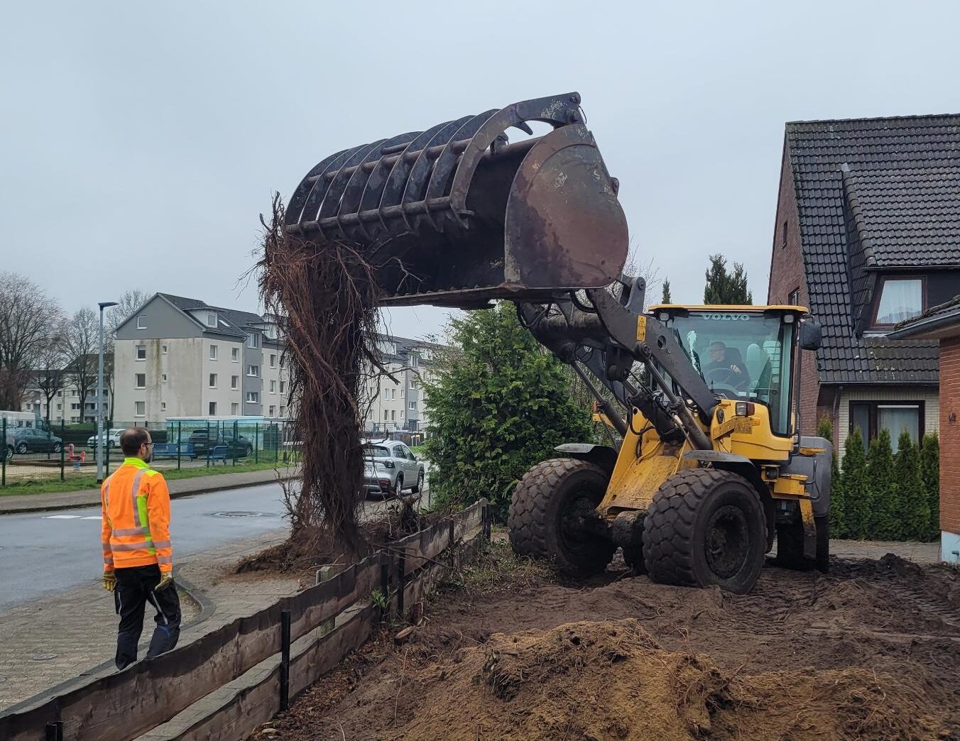 Unser hilfsbereiter Nachbar Timo sorgte mit seinem beeindruckenden 13-Tonnen-Radlader dafür, dass die zahlreichen Baumwurzeln im Vorgarten schnell Geschichte waren.